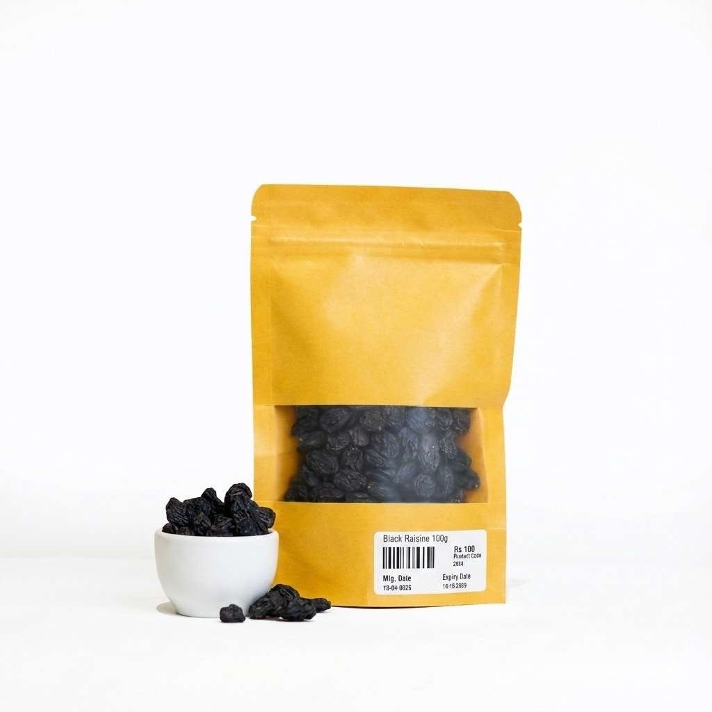 Black raisins are produced by drying mature black grapes until most of their water content is evaporated, concentrating their nutrients and natural sweetness. This drying process makes them soft, chewy, and ideal for snacking or recipe use.